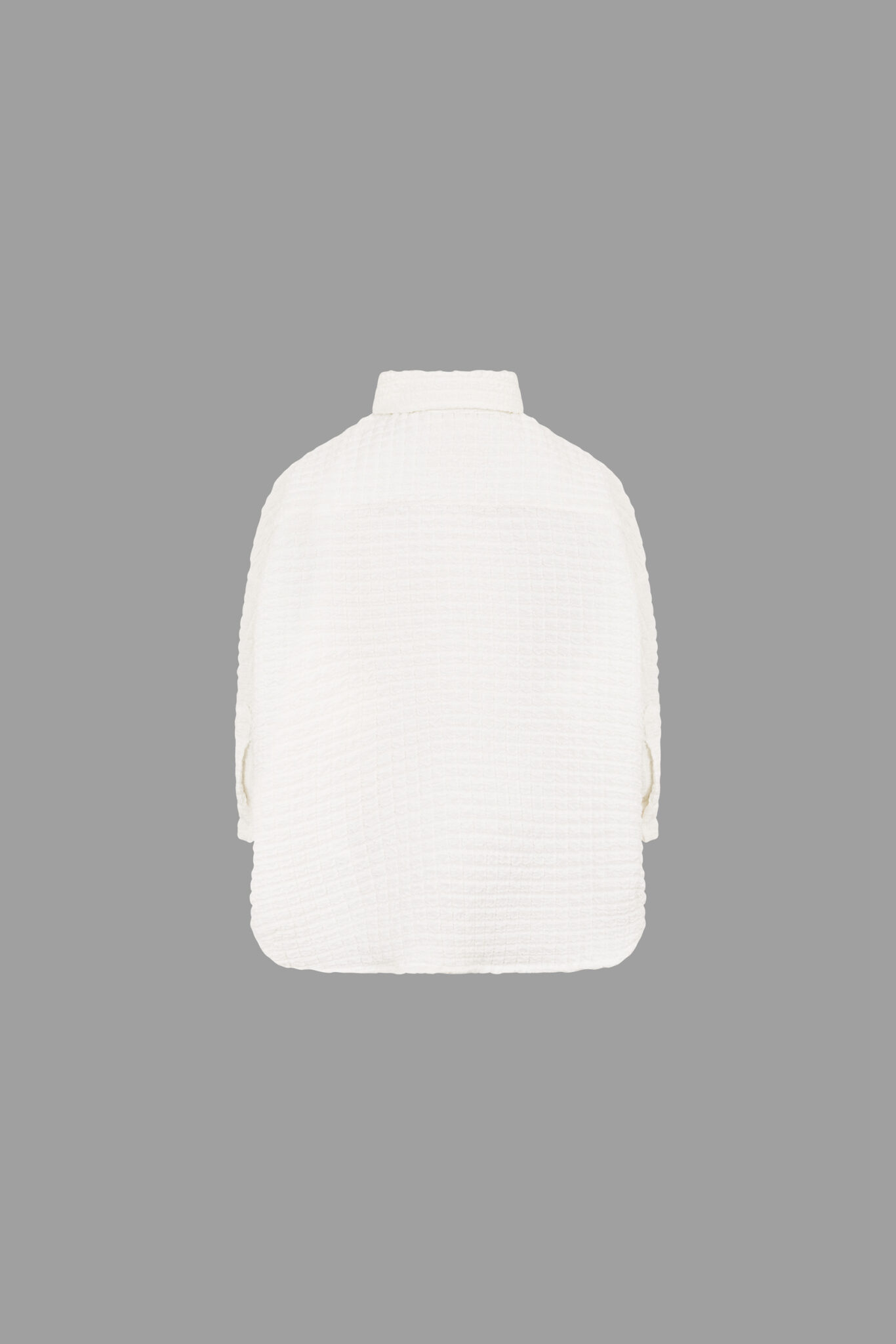 modello: Camicia in tessuto goffrato dai volumi oversize con abbottonatura centrale.