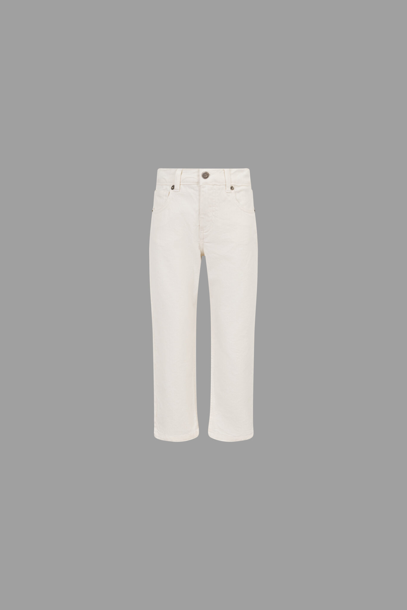 modello: jeans in drill di cotone a vita media, con gamba dritta, chiusura a bottone, due tasche frontali e due posteriori.