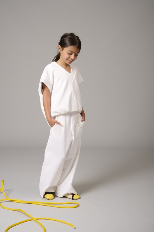 modello: Pantaloni oversize in punto milano. Con elastico in vita e tasche laterali.