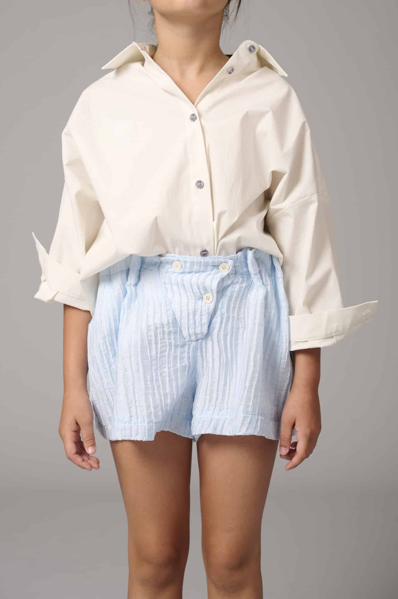 modello: Shorts arricciato con abbottonatura frontale, elastico in vita e tasche laterali. Il tessuto mosso dona movimento al capo.